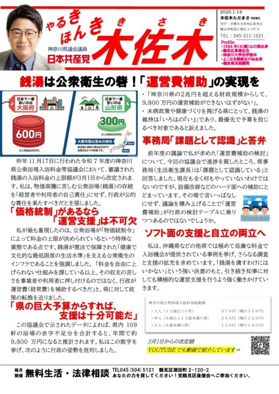 新着情報 NEW ブログニュース活動日誌 【やるき ほんき 木佐木】銭湯は公衆衛生の砦!「運営費補助」の実... 2026.1.14 ブログニュース活動日誌 【やるき ほんき 木佐木】負担増と福祉切り捨てに「NO」! 本会議反... 2026.1.7 ブログニュース活動日誌 【やるき ほんき 木佐木】 高市内閣の「核容認」論に待った!県議... 2025.12.24 すべて見る