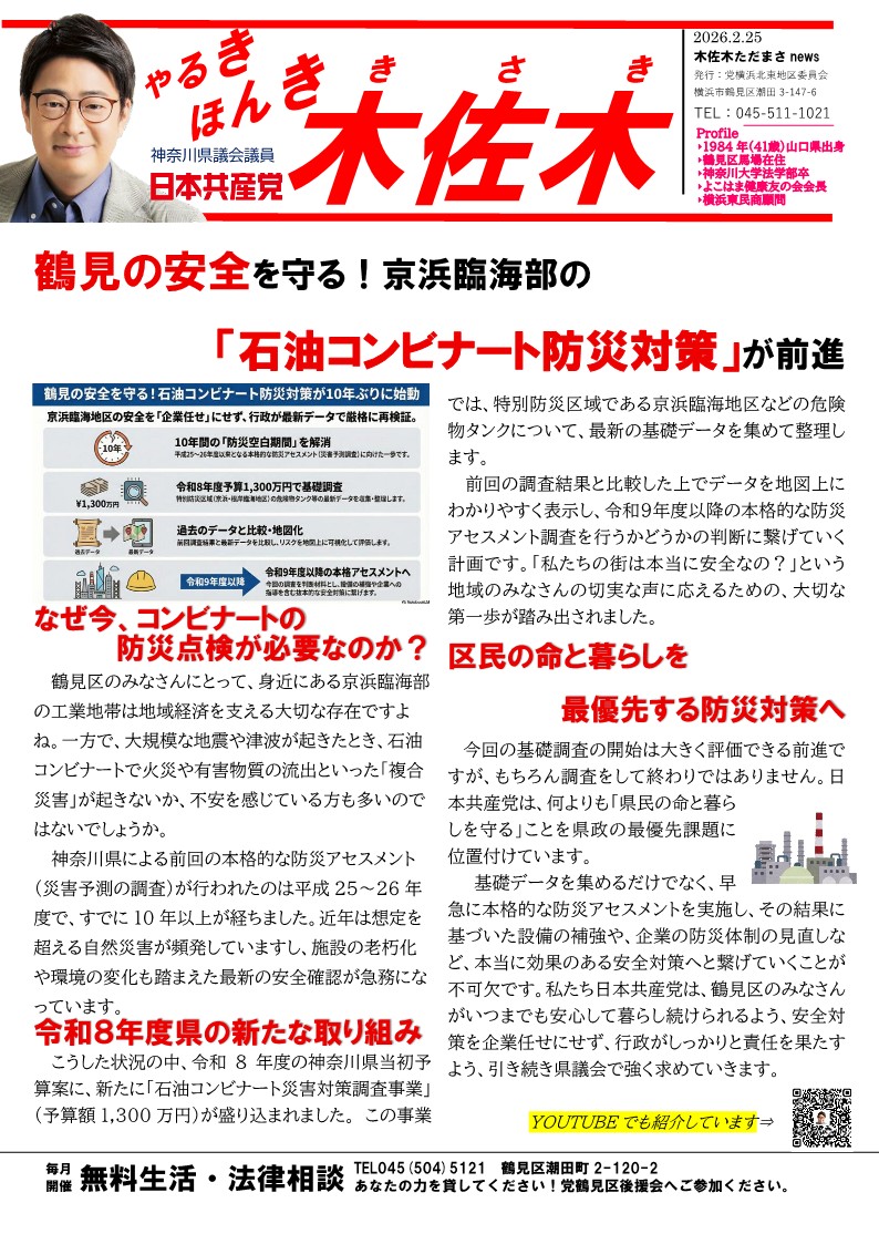 新着情報 NEW ブログニュース活動日誌 【やるき ほんき 木佐木】鶴見の安全を守る!京浜臨海部の「石油コ... 2026.2.25 ブログニュース活動日誌 【やるき ほんき 木佐木】物価高で税収増。だからこそ、暮らしに還... 2026.2.18 ブログニュース活動日誌 【やるき ほんき 木佐木】銭湯は公衆衛生の砦!「運営費補助」の実... 2026.1.14 すべて見る