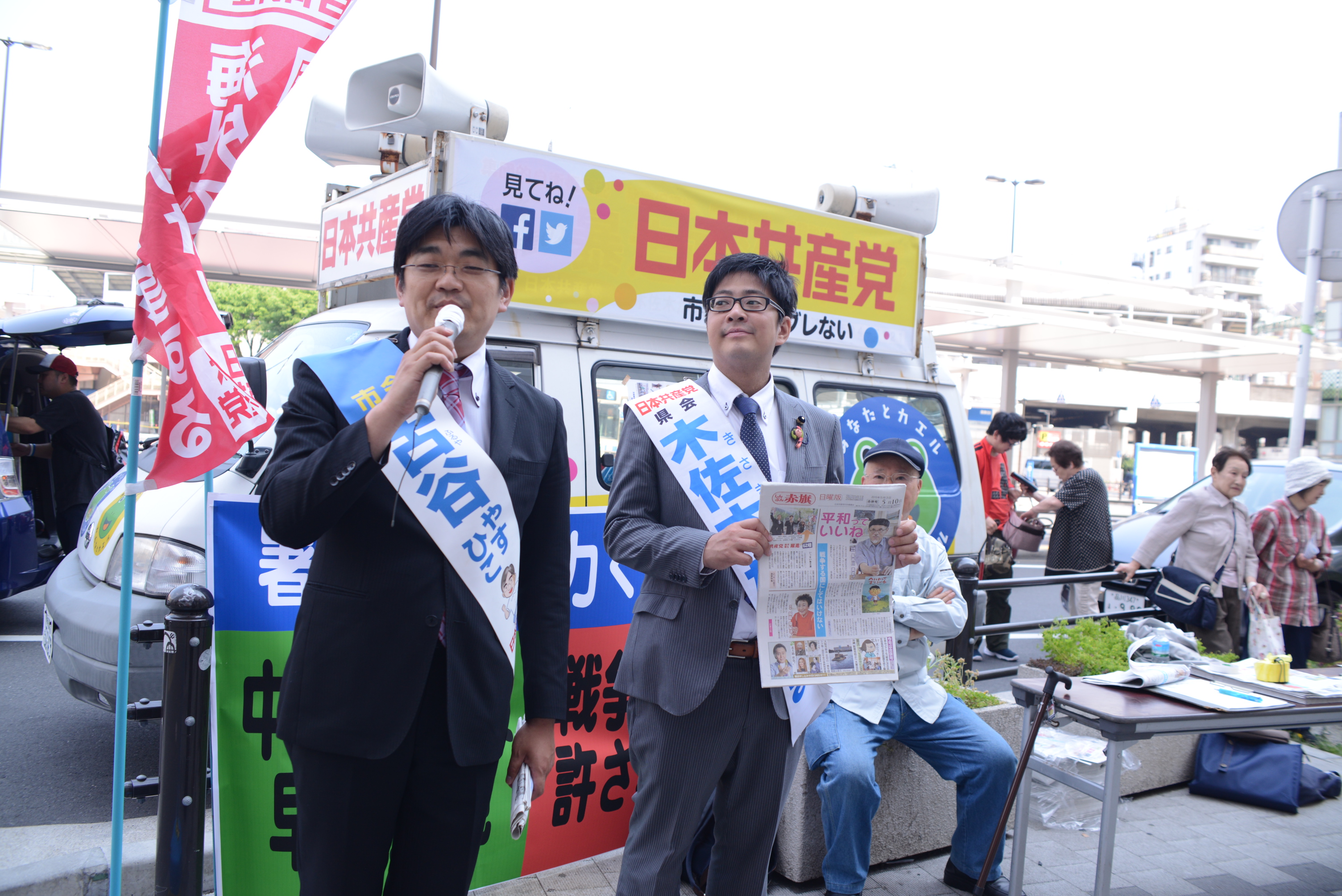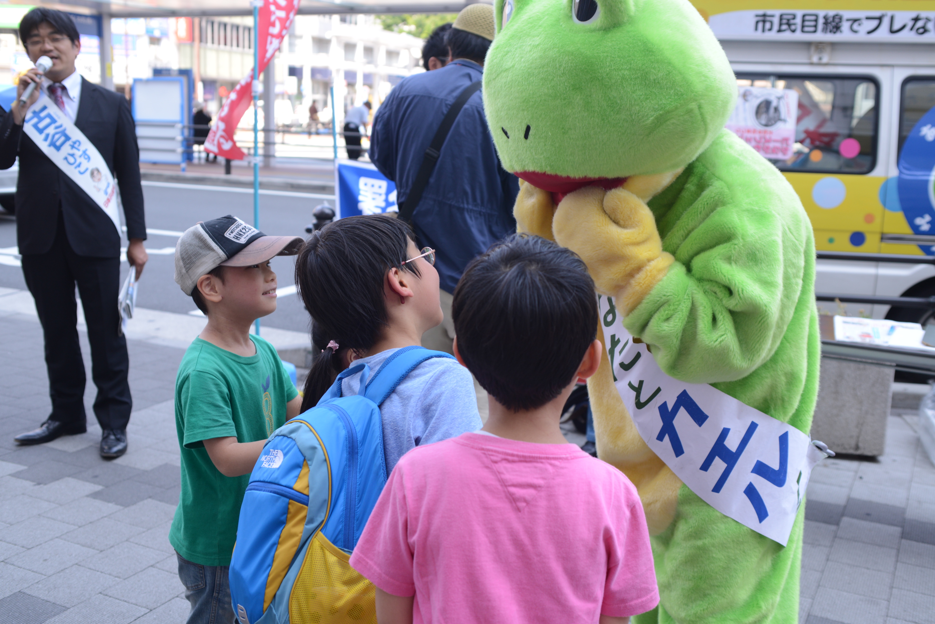 今日10日は、選挙後の最初のロングラン宣伝です。午後1時から4時まで、鶴見駅東口で行いました。いつもの日曜日より人出が多い気がします。「戦争立法を許すな」「若者を戦場に送るな」安倍政権の暴走ストップなど次々とマイクを握って訴えました。ビラを受け取る人、がんばれと声援を送る人、署名に駆け寄る人、「カエルさん」に寄って握手を求める子供たち、天気もよく、大勢の人たちに訴えが届いたロングランでした。
